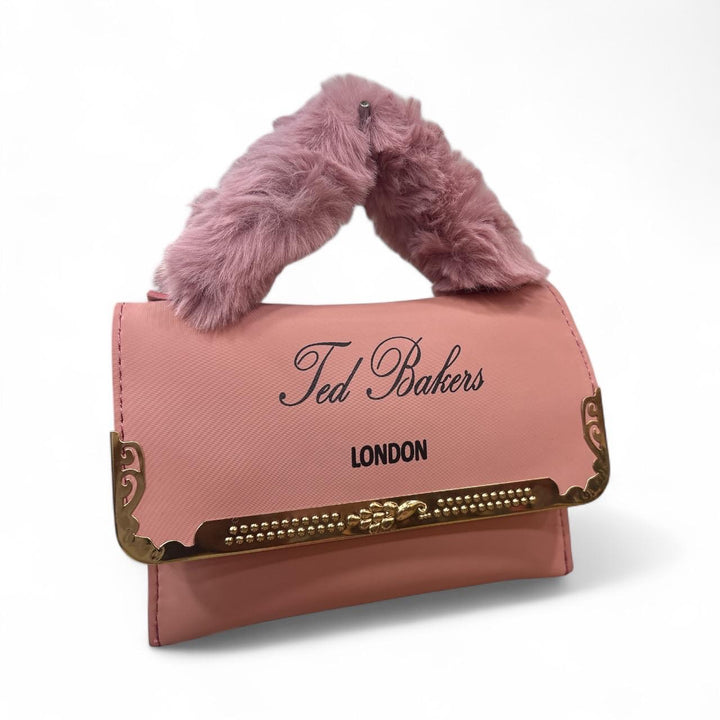 Short Description: A structured blush-pink handbag adorned with plush pom-poms and ornate gold detailing. Designed by Ted Baker London, it blends whimsical charm with regal sophistication.