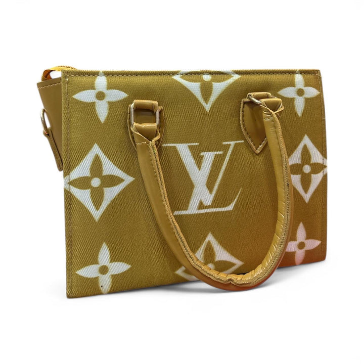 “A golden brown statement piece adorned with heritage-inspired white motifs. The structured silhouette and polished leather accents make it a timeless companion for day-to-night elegance.”